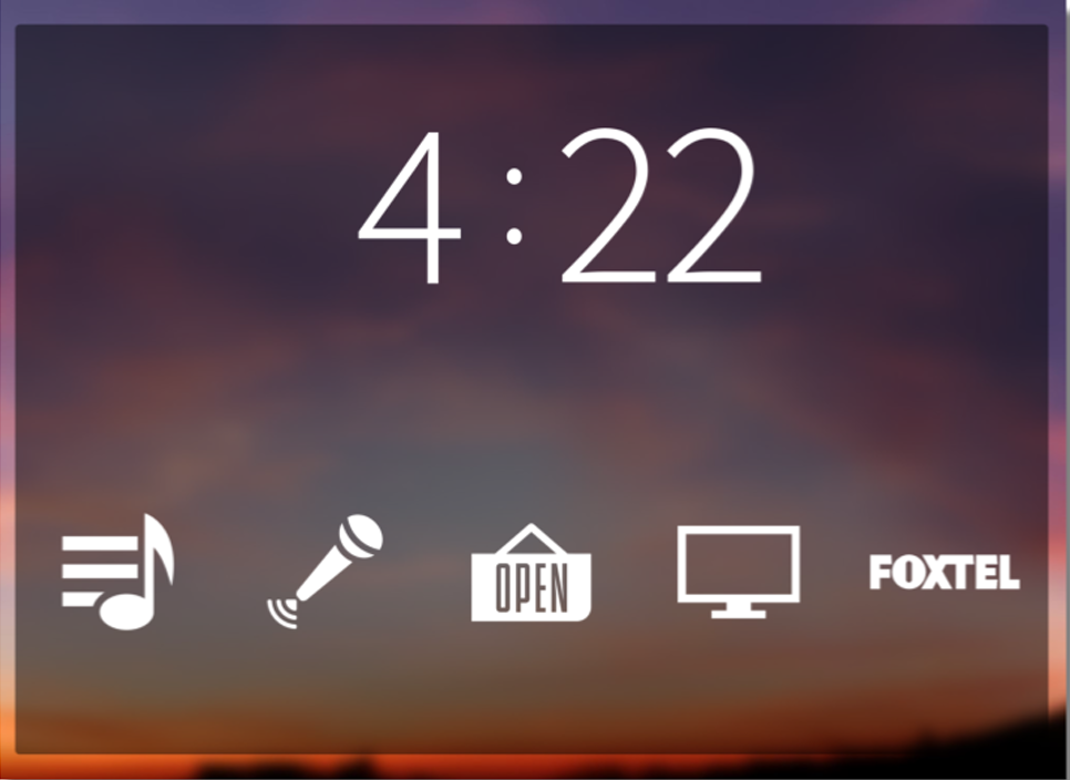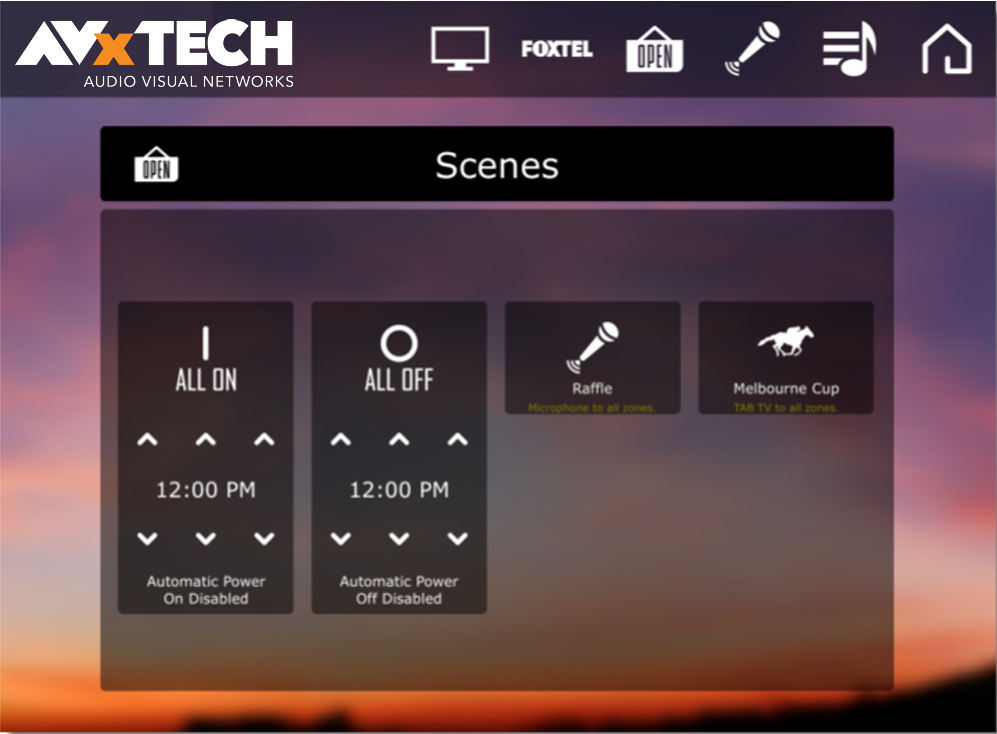 The AV system control looks and works the same on the 8β fixed wall control screen, iPad, or mobile phone.