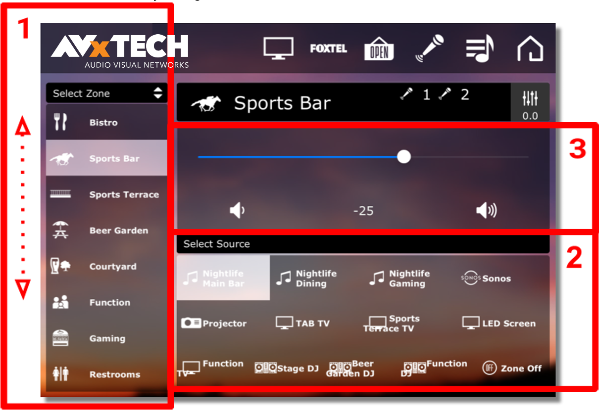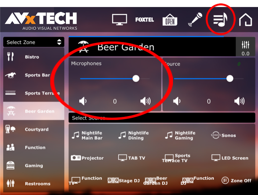After enabling Microphone Volume Control, sliders will appear on the Audio Source and Zone Selection pages.